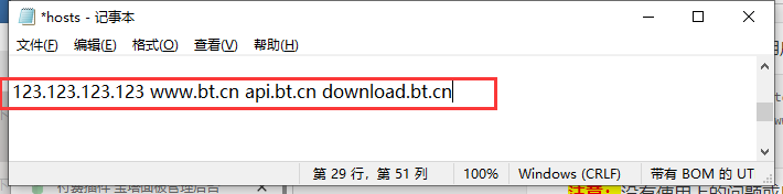 使用文本编辑器打开后,如果发现之前有指定过bt.cn的hosts,例如下图(没有的话忽略这一步,直接指定节点):